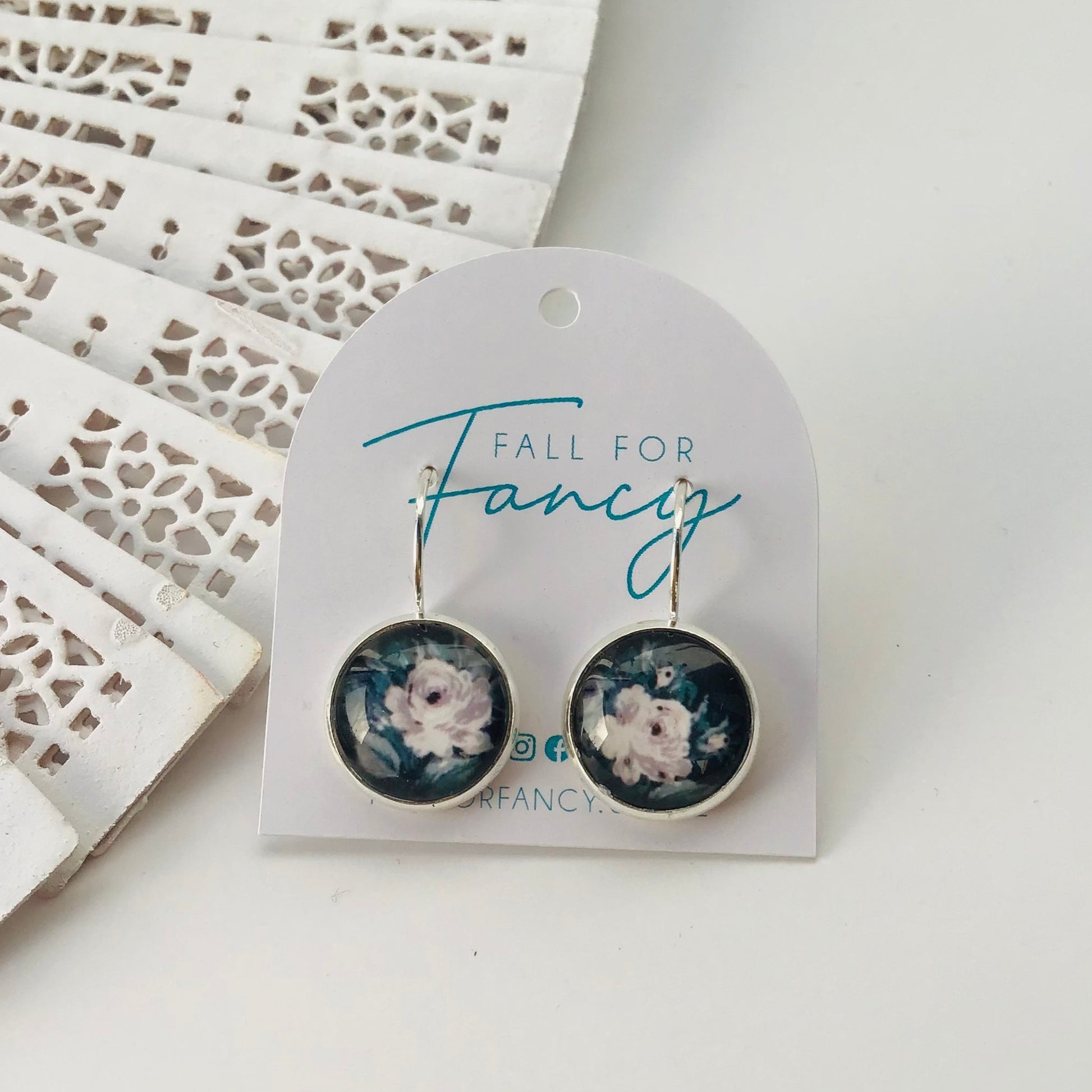 Drop style handmade glass dome earrings. These have a lever back hook, so they won’t accidentally fall out if they catch on your clothing or scarf